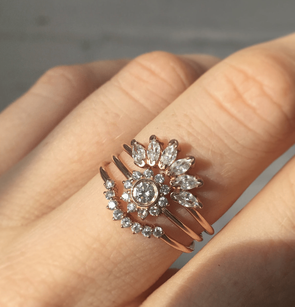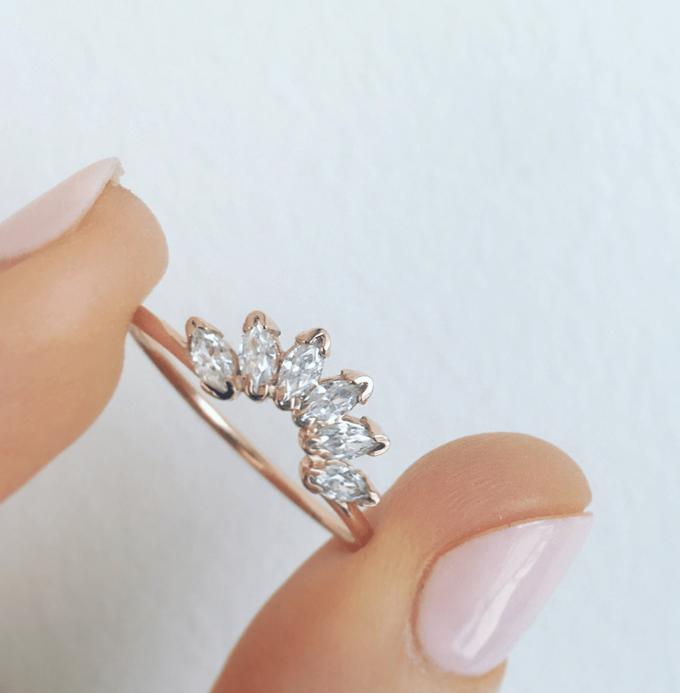 Description du produit : entièrement fabriqué à la main aux États-Unis ; or rose massif 14 carats ; 6 diamants blancs naturels taille marquise (4x2 mm) de clarté SI et de couleur G/H ; poids total en carats = 0,6 carats