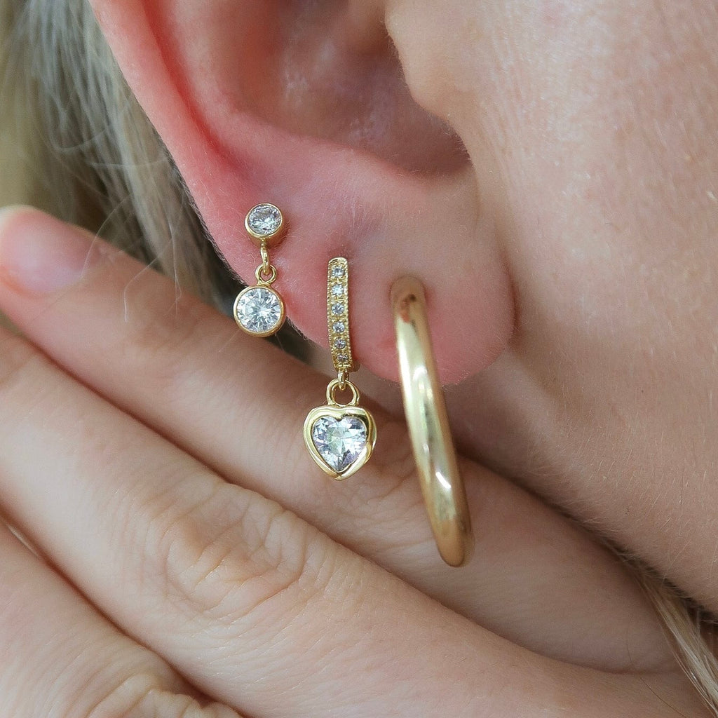 CZ Double Drop Stud earrings are designed to add effortless sparkle to any look. Crafted with 14K gold-filled metal for lasting quality and shine, these earrings feature a 3mm round cubic zirconia stud with a 4mm round CZ charm that delicately dangles below, catching the light with every movement. Perfect for a 2nd or 3rd pierciing!