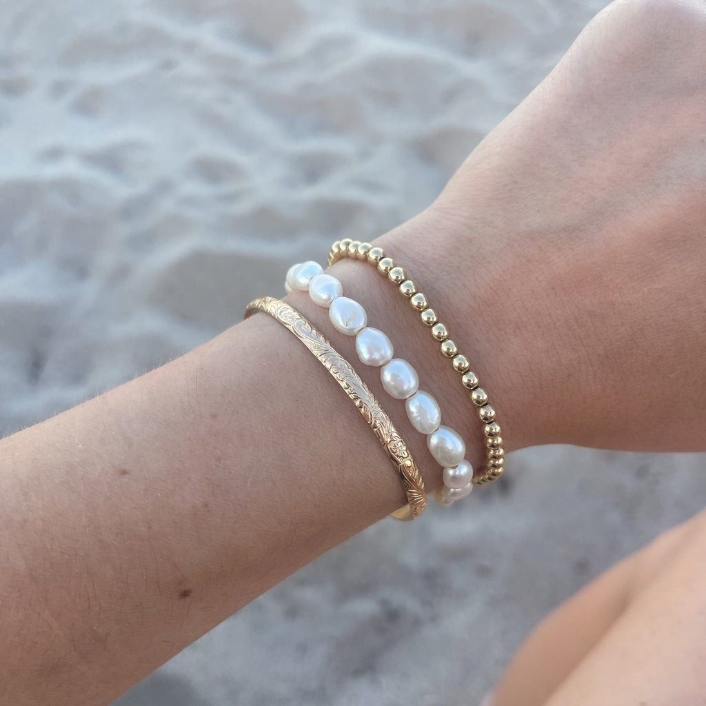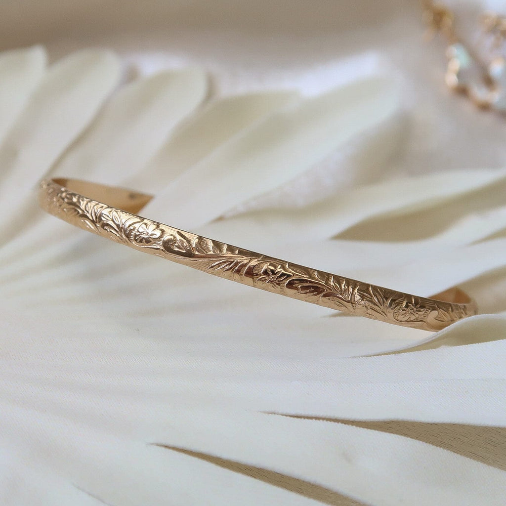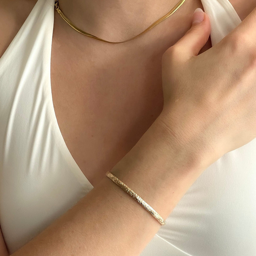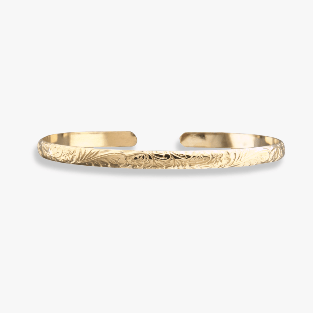 Inspired by the timeless beauty of Hawaiian heirloom jewelry, the Kauai Cuff brings tradition into the everyday. Crafted from thick 14k gold filled wire with a richly detailed floral pattern, this adjustable cuff is made to stack, shine, and stay with you through every season.