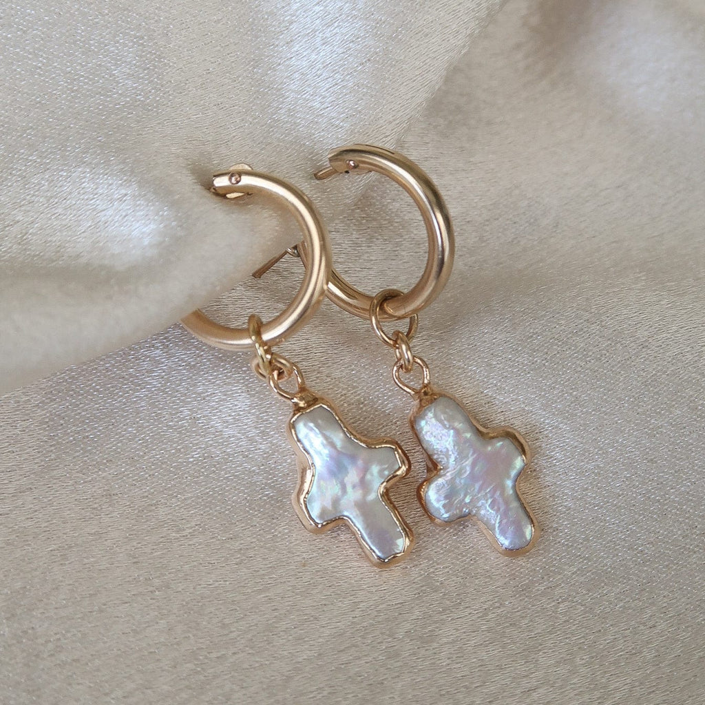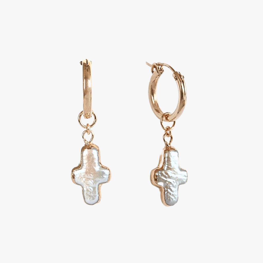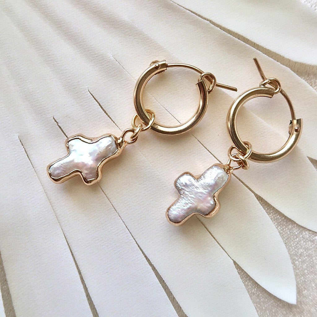 Our Serena Earrings feature luminous pearl cross charms suspended from 15mm 14k gold filled hoops, these earrings are waterproof, hypoallergenic, and made for everyday wear.