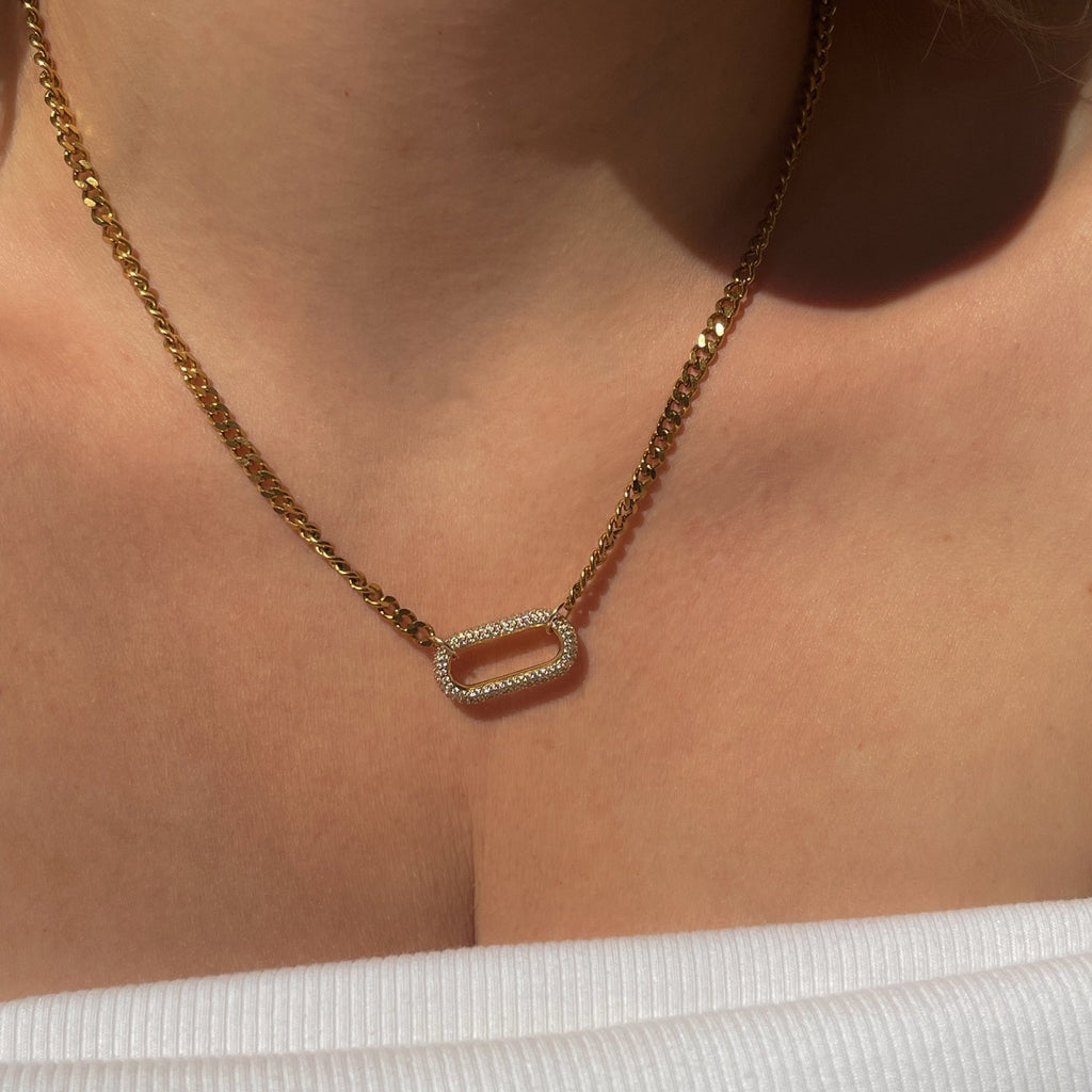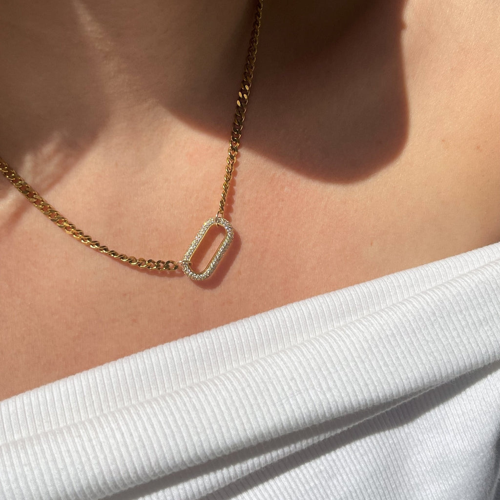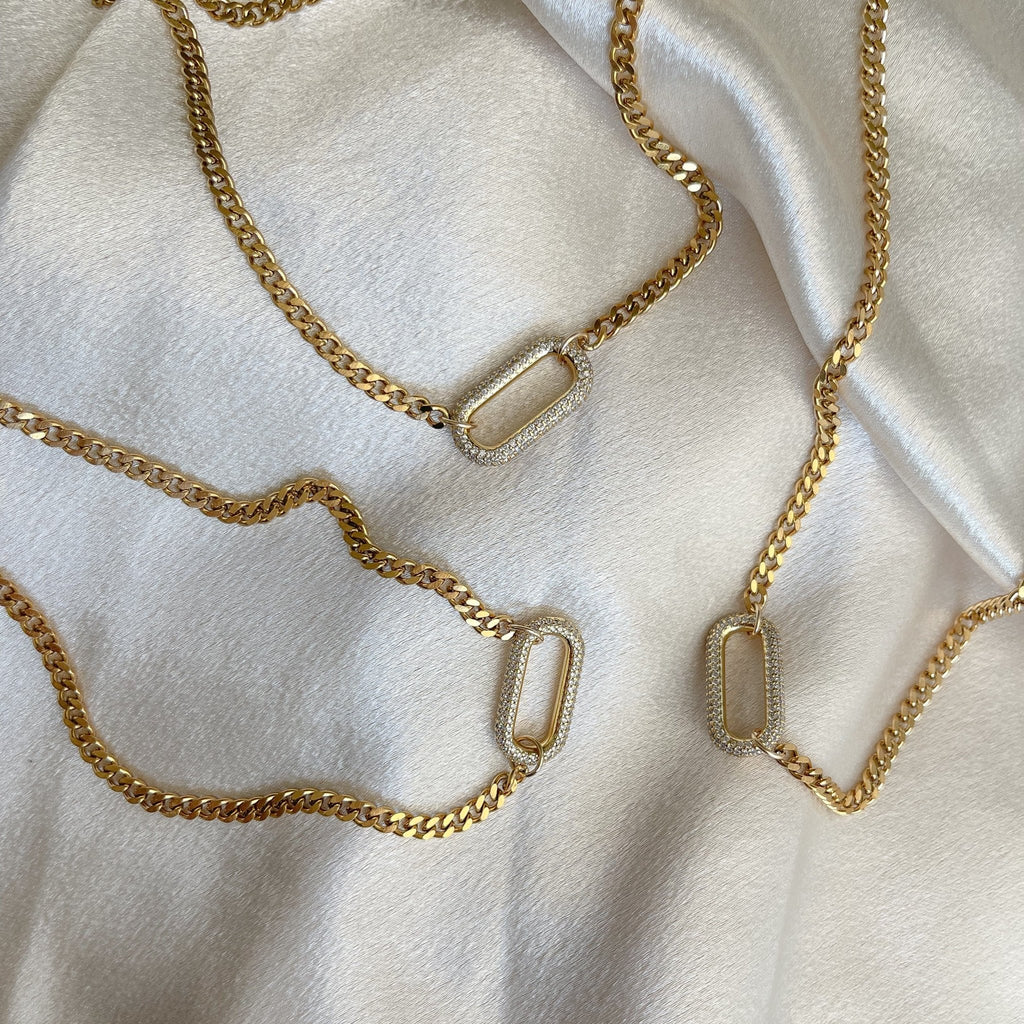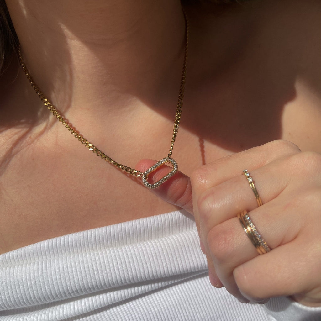 Featuring a thick, bold curb chain and a radiant rectangular CZ pavé centerpiece, the Vivienne Necklace strikes the perfect balance between modern edge and timeless sophistication. Whether worn alone or layered, this piece adds instant glamour to any outfit.