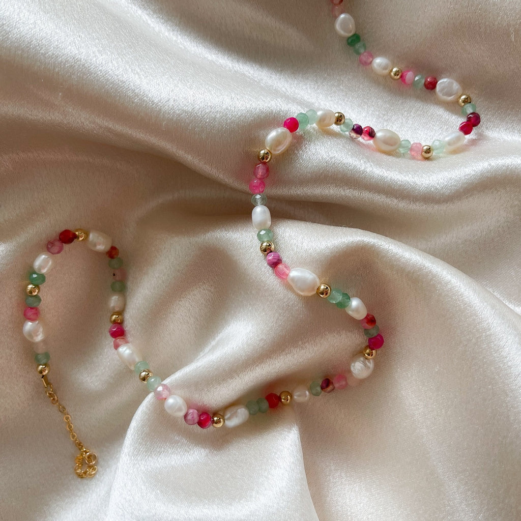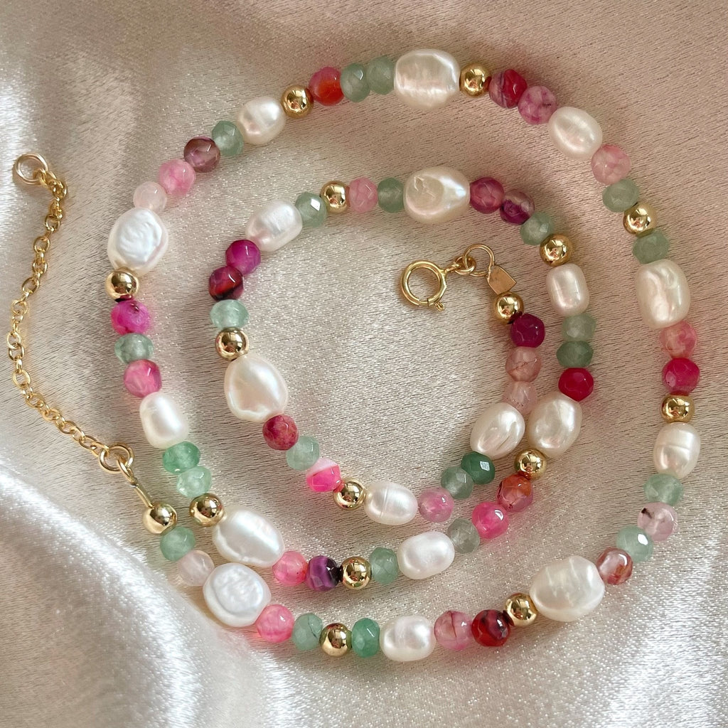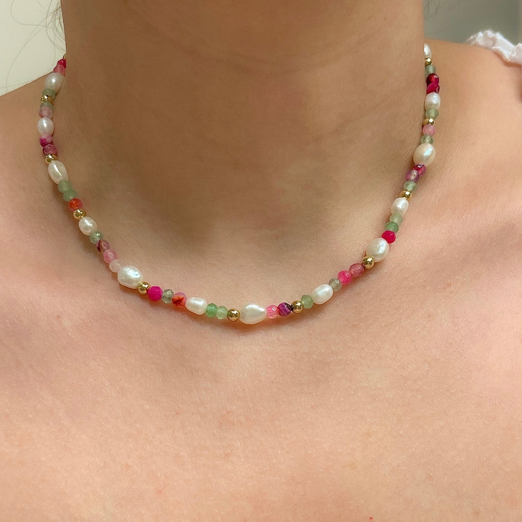Add a playful pop of color to your look with this handcrafted beaded candy necklace, featuring real gemstones and freshwater pearls. This necklace is made with soothing aquamarine beads, soft pink agate stones, and natural freshwater pearls, accented with dainty 4mm 14k gold filled beads for a touch of luxury and lasting shine.