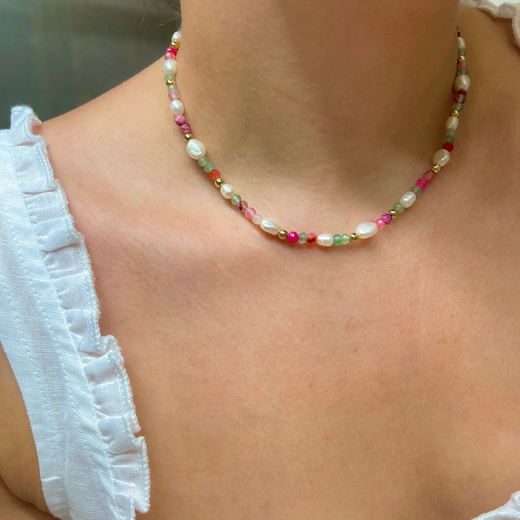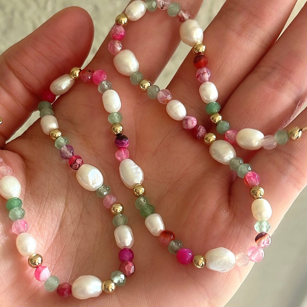 Each necklace is carefully strung by hand, combining the trendy colorful candy jewelry vibe with timeless pearls. Wear it alone for a sweet statement or layer it with your favorite gold chains for a unique boho look.