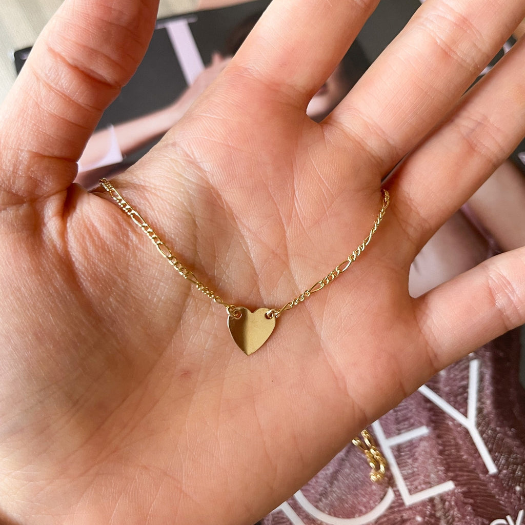 Piccolo cuore riempito in oro 14k da 10 mm su catena Figaro o catena portacavi riempita in oro 14k.
