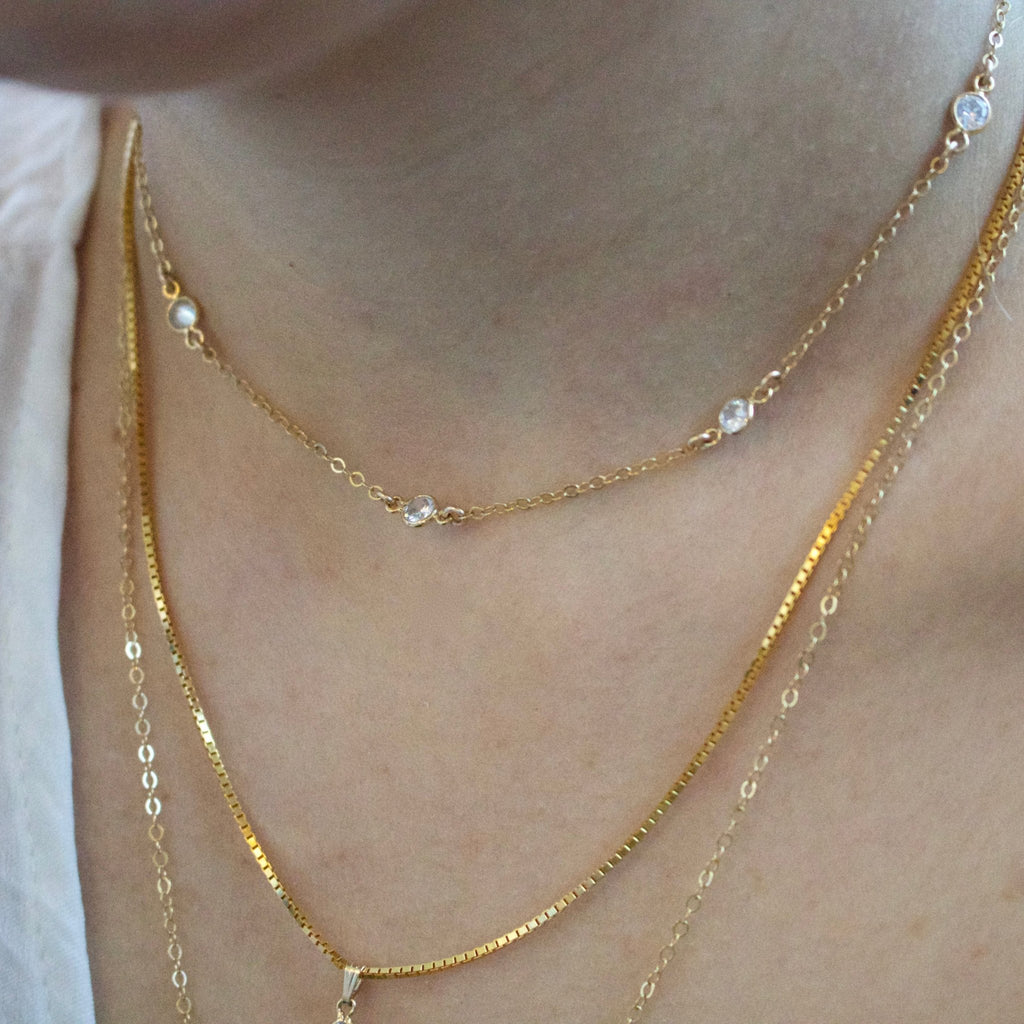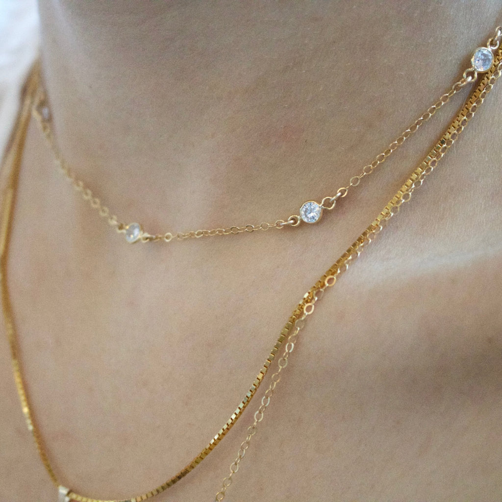 -5 simulated gold filled Cz diamonds on a 14k gold filled chain.