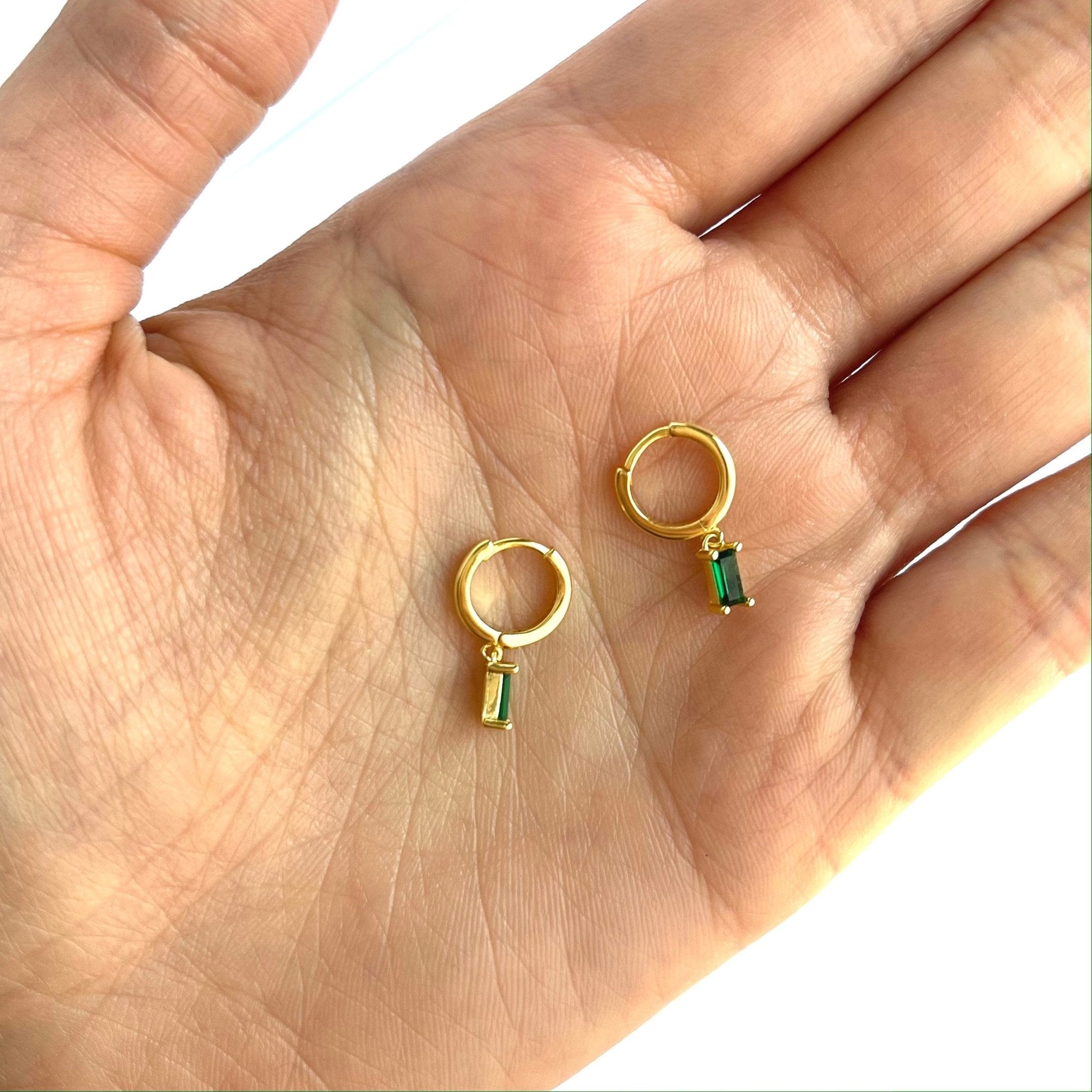 1 available. 925 gold vermeil mini huggie with green cz charms.