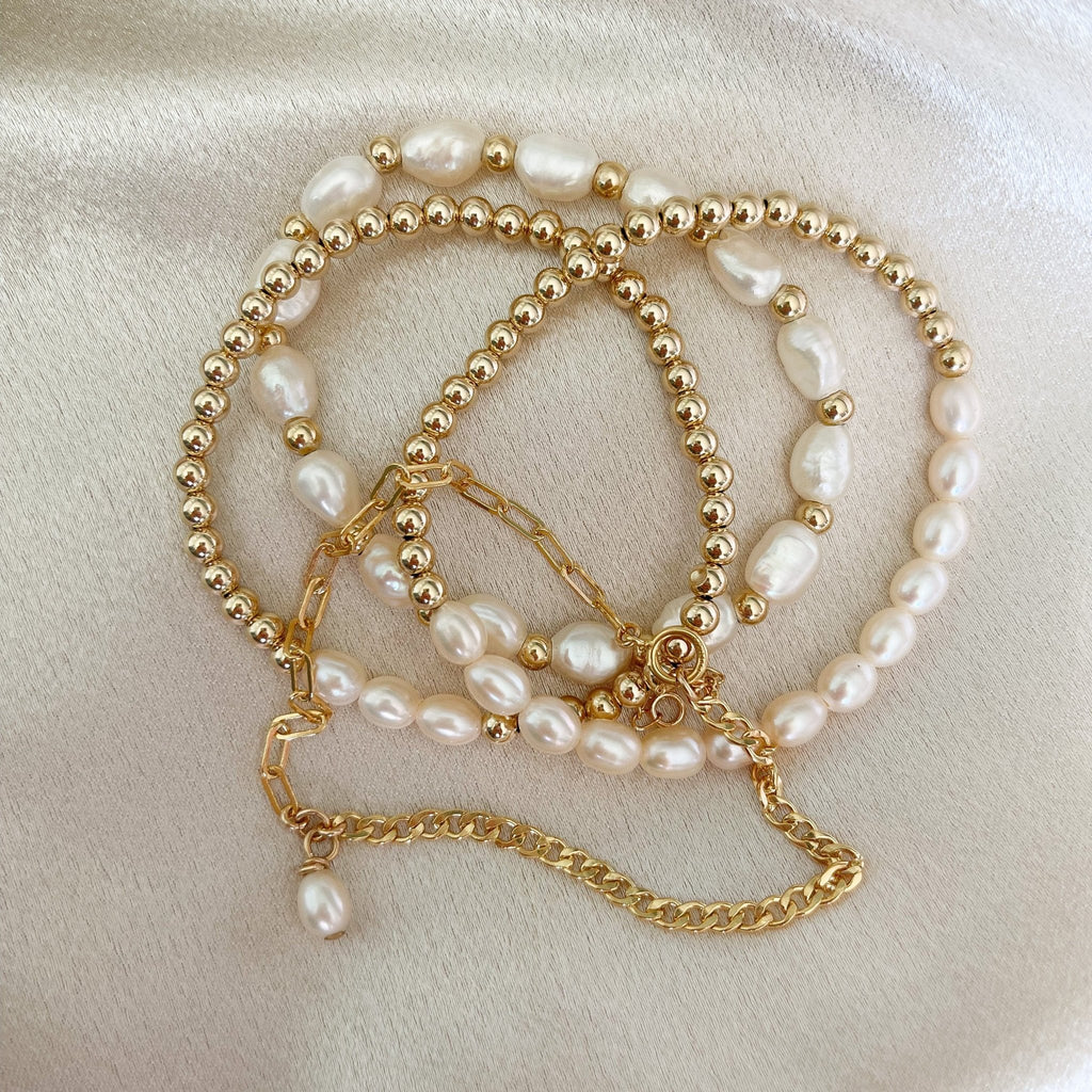 This cute bracelet is half 14k gold filled beads and half white freshwater pearls. Hand strung on a stretchy band.