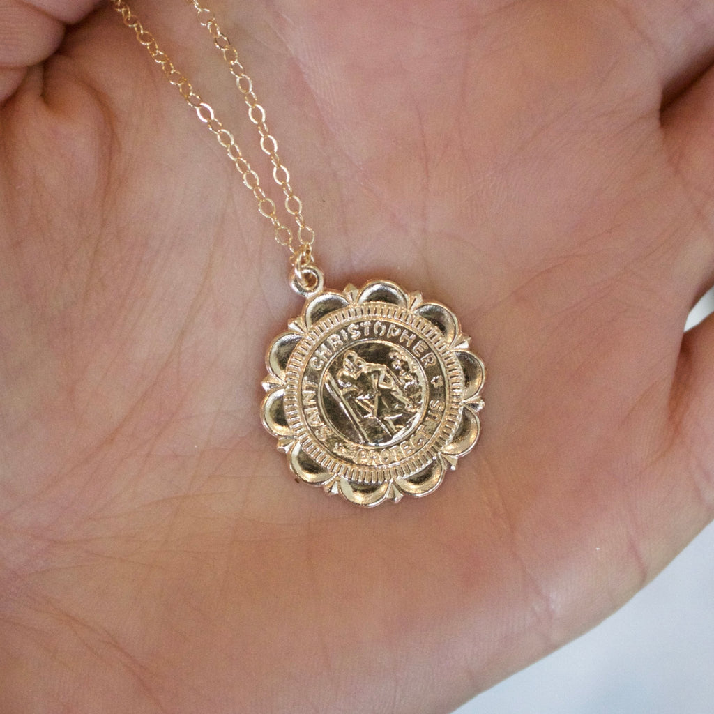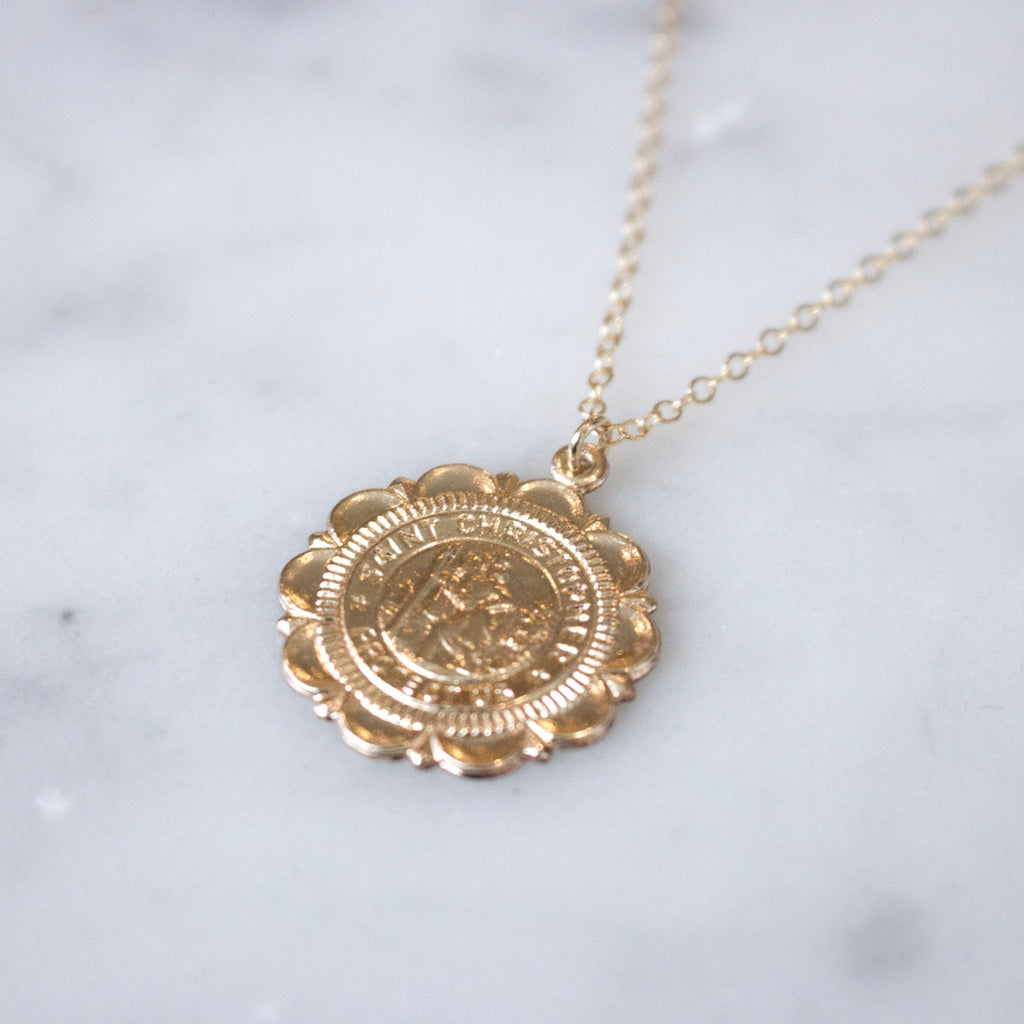14k gold filled 22 mm Saint Christopher coin on a 14k gold filled chain.