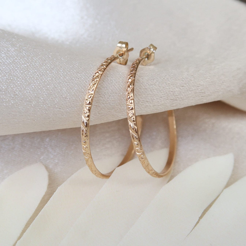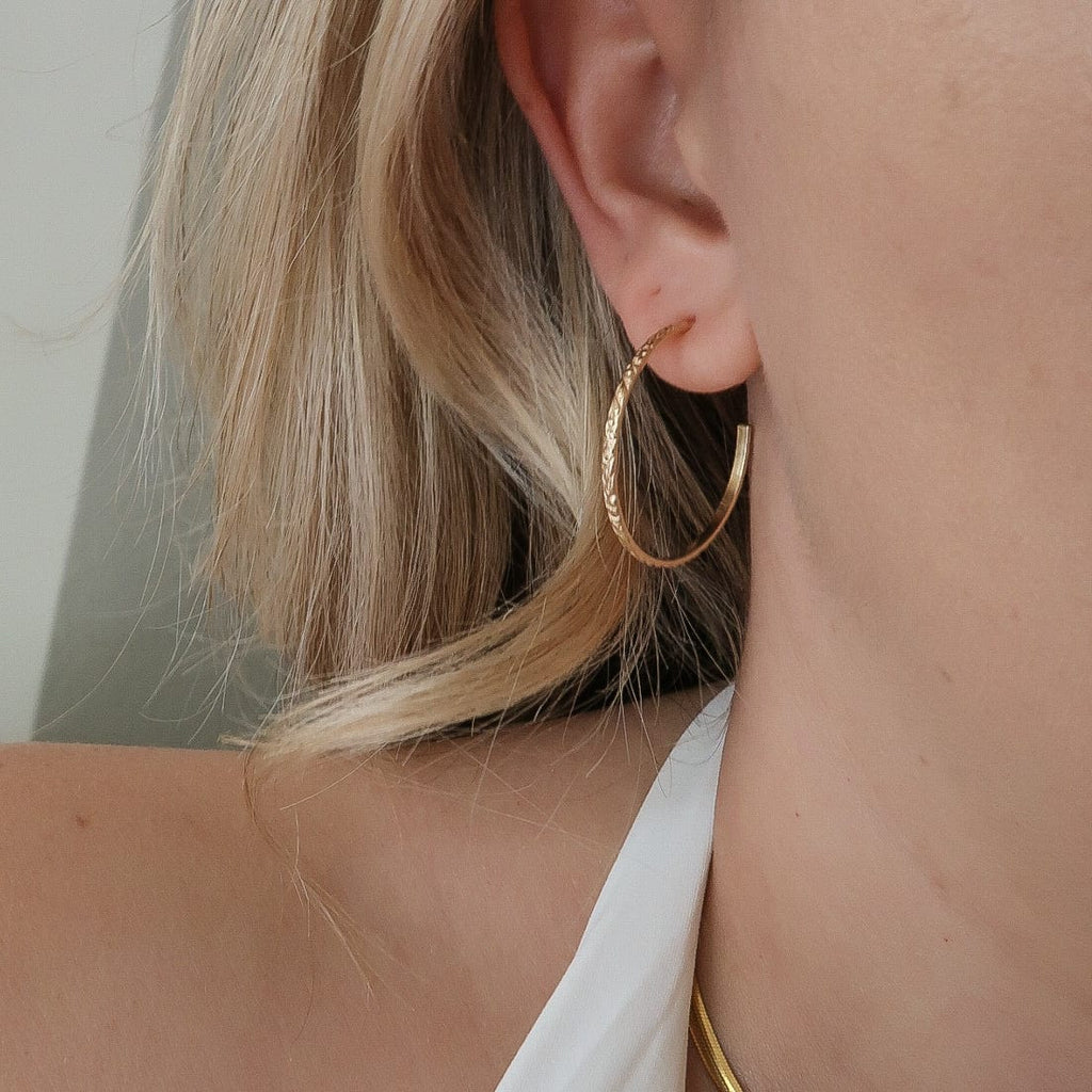 Inspired by the vibrant Lehua flower, a symbol of love and life in Hawaii, the Lehua Hoops are a delicate yet bold statement piece. These 30mm 14k gold filled hoops feature a floral-patterned design that brings together elegance and nature in a timeless way. Lightweight and perfect for everyday wear, they’ll easily become your go-to for adding a touch of effortless beauty to any outfit.